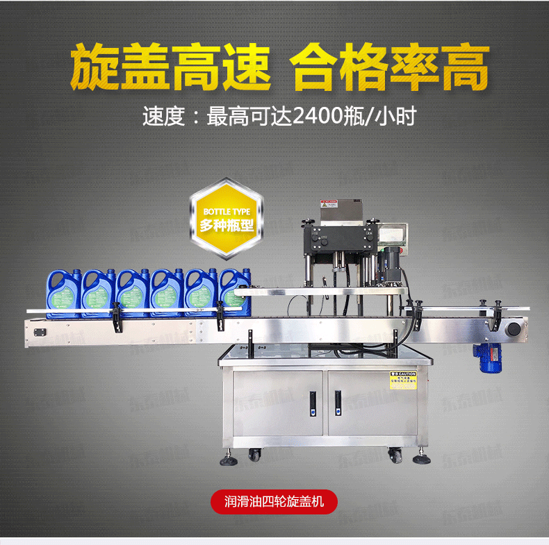 全自動旋蓋機是參照國機型改進設計、旋蓋速度快,合格率高、操作方便。可適用于食品、制藥、日化、農藥、化妝品等行業的不同瓶形的旋蓋。四臺調速電機分別用于供蓋、夾瓶、傳送、旋蓋,機器自動化程度高,穩定性好,調節方便,更換瓶形或蓋時無須備件,只需作調整即可完成(如配上蓋機,可進行自動上蓋)可以根據實際需要選配。