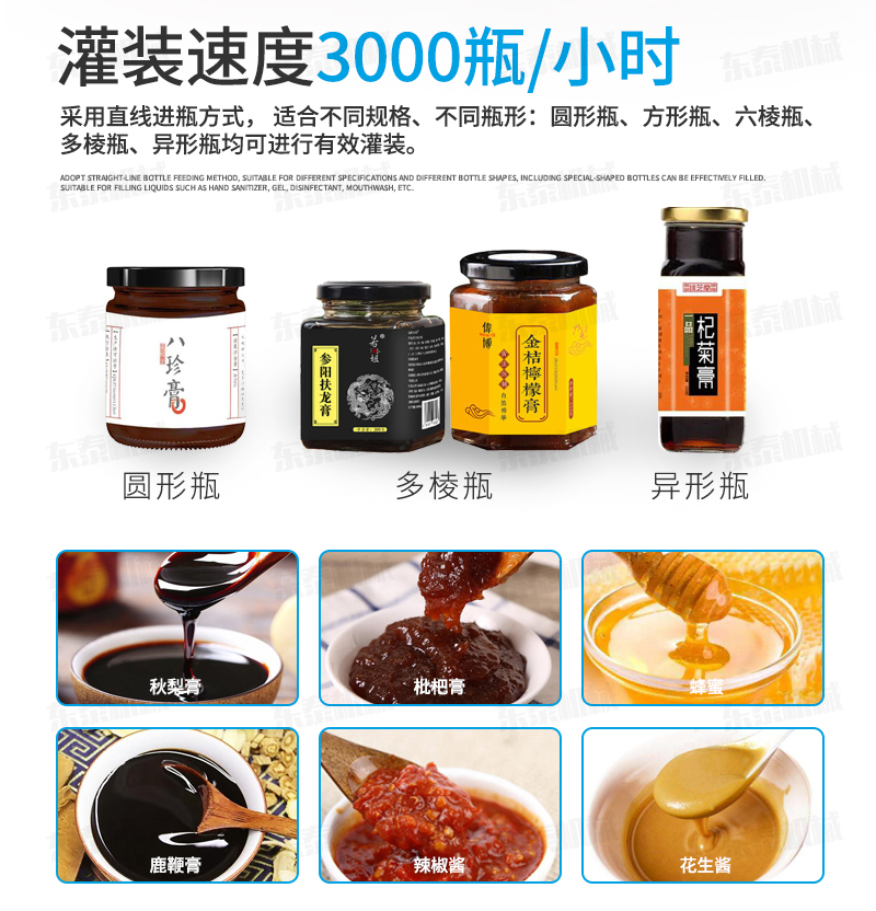 秋梨膏灌裝機生產線設備適用于各種1、各種膏滋如:秋梨膏、枇杷膏、鹿鞭膏、蜂蜜等的灌裝。2、調味醬如:香菇醬、辣椒醬、豆瓣醬、花生醬、芝麻醬、牛油火鍋底料、紅油火鍋底料。3、采用多規格的灌裝轉閥、灌裝頭,可適應不同客戶物料的灌裝需求。