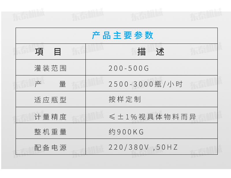 3、灌裝機采用橫推料的方式,大大縮短了下料斗到灌裝頭的距離,提高了灌裝速度,更重要的是解決了含油量大的物料在灌裝過程中出現的有些瓶油多,有些瓶醬多的灌裝難題,大大提高了灌裝精度。