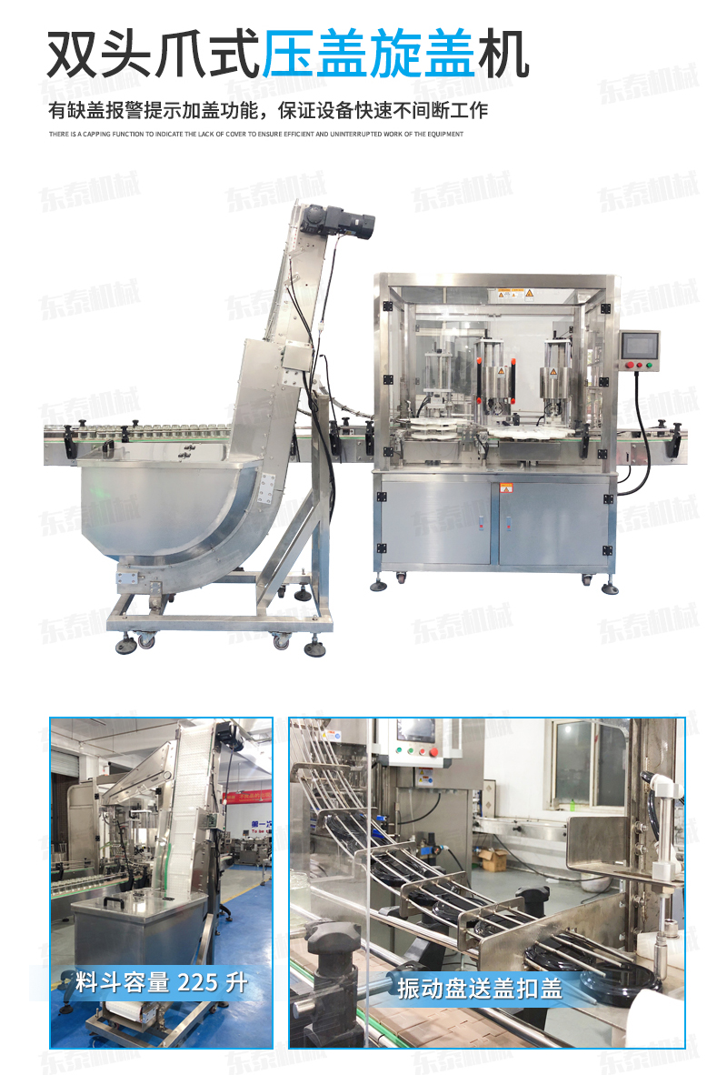 該枇杷膏灌裝機生產線-上蓋機結合用戶使用的情況,摒棄了傳統轉盤式真空旋蓋機的弊端,研制開發的新型設備,設備自動檢測到設定數量的瓶子、蓋子進入到真空旋蓋機內,旋蓋機彩色顯示屏會實時顯現旋蓋狀況,整機多點檢測,當進口無瓶無蓋、出口堵塞、定位不準、瓶身傾倒均自動停機。單個旋蓋頭達到的真空度都可以單獨顯示,單獨調整。合格率達到100%!